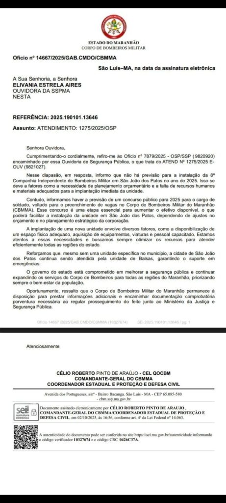 Em consulta ao Corpo de Bombeiro Militar do Estado, através da ouvidoria da SSPMA, a informação é que não há previsão para a instalação do Corpo de Bombeiros em São João dos Patos em 2025, conforme ofício abaixo.